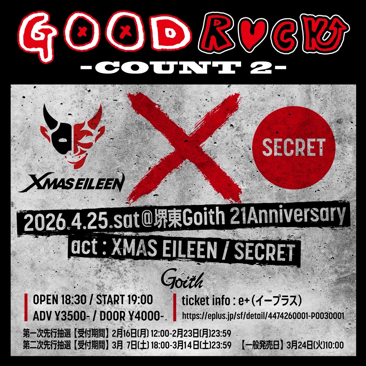 堺東 Goith(ゴイス) スケジュール 2026.4.25(Sat) XMAS EILEEN Drum presents 【GOOD ROCK -COUNT 2 - 】 [ACT] XMAS EILEEN / and...secret artist [OPEN/START] 18:30/19:00 [料金] ADV/DOOR ¥3500/¥4000 (問)堺東 Goith 072-229-1313 http://goith.jp