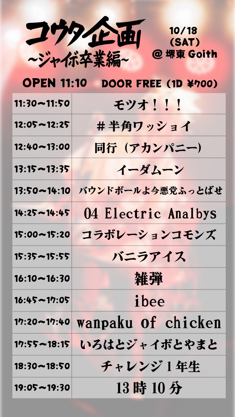 - モツオ!!!/ #半角ワッショイ / 同行(アカンパニー) / イーダムーン / バウンドボールよ今悪党ぶっ飛ばせ / 04 Electric Analbyz / コラボレーションコモンズ / バニラアイス / 雑弾 / ibee / wanpaku of chicken / いろはとジャイボとやまと / チャレンジ1年生 / 13時10分