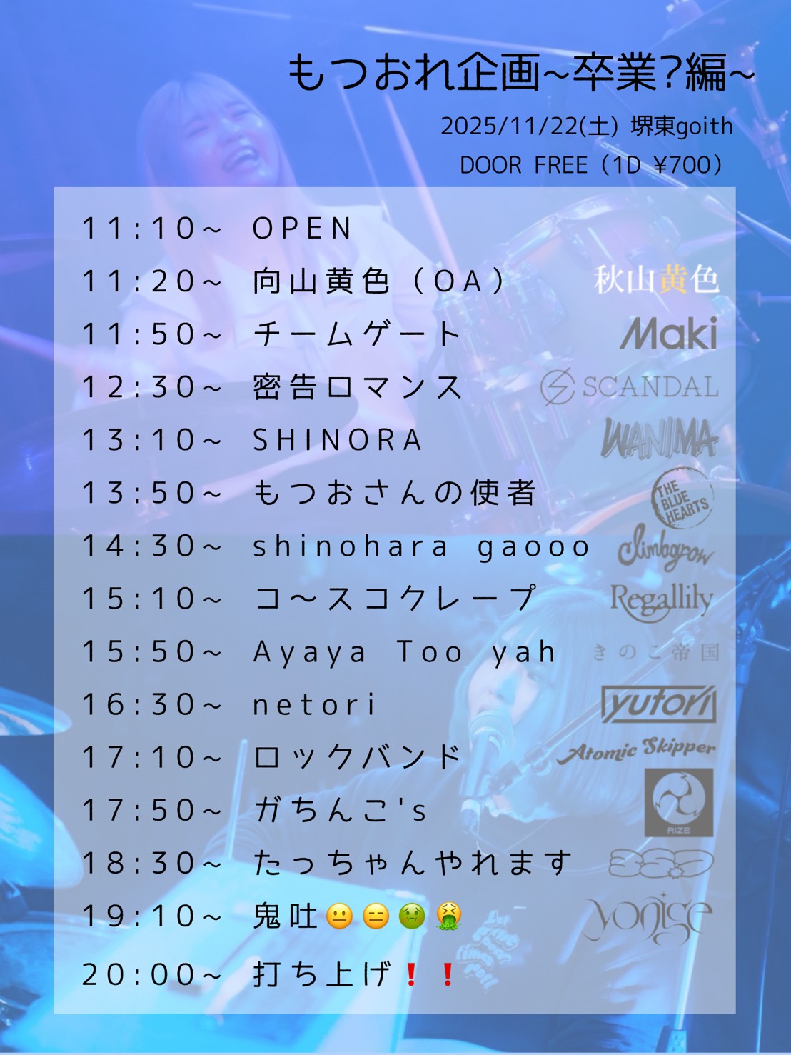 - 向山黄色 / チームゲート / たっちゃんやれます / SINORA / もつおさんの使者 / shinohara gaooo / コ〜スコクレープ / Ayaya Too yah / netori / ロックバンド / ガちんこ's / 密告ロマンス / 鬼吐