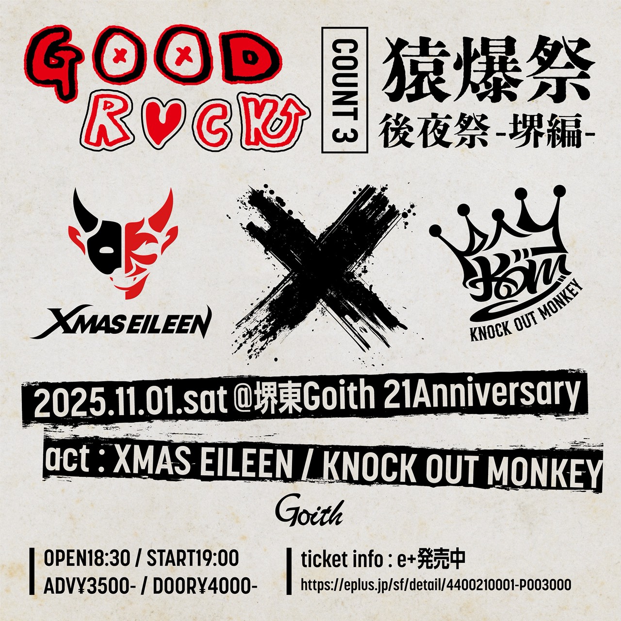 堺東 Goith(ゴイス) スケジュール 2025.11.01(Sat) "GOOD ROCK -COUNT3 & 猿爆祭 後夜祭-堺編-" @堺東Goith 21Anniversary [ACT] XMAS EILEEN / KNOCK OUT MONKEY [OPEN/START] 18:30/19:00 [料金] ADV/DOOR ¥3500/¥4000 (問)堺東 Goith 072-229-1313 http://goith.jp