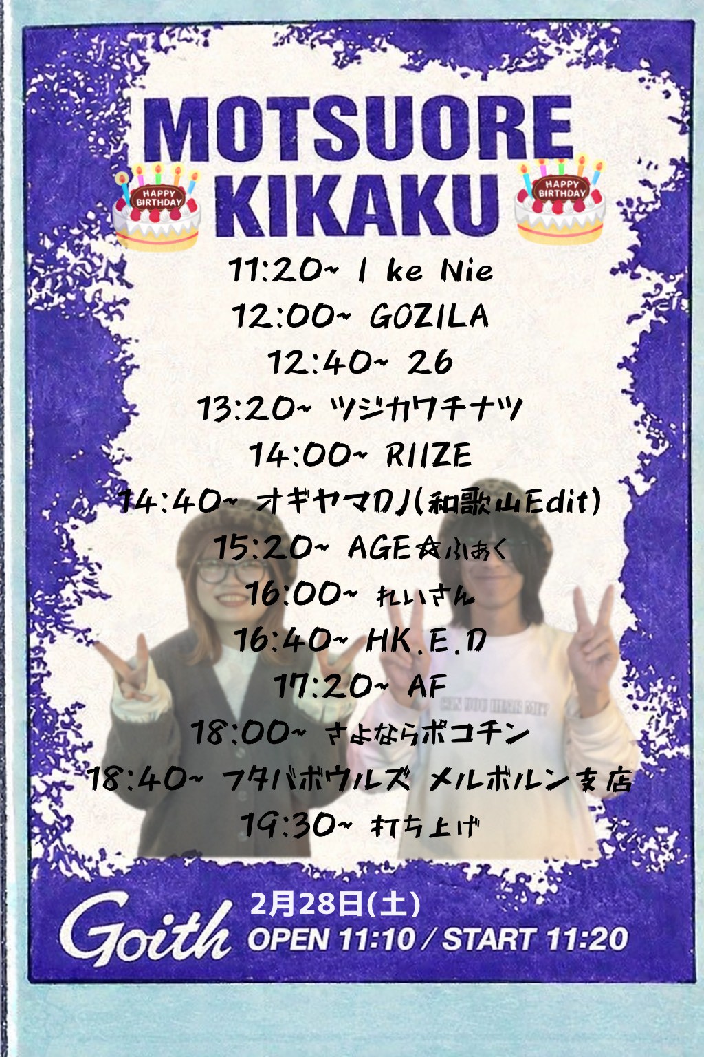 堺東 Goith(ゴイス) スケジュール 2026.2.28(Sat) もつおれ卒業企画 [ACT] I ke Nie / GOZILA / 26 / ツジカワチナツ / RIIZE / オギヤマDJ(和歌山Edit) / AGE☆ふぁく / れいさん / HK.E.D / AF / さよならポコチン / フタバボウルズ メルボルン支店 [OPEN/START] 11:10/11:20 [料金] FREE(+1D¥700) (問)堺東 Goith 072-229-1313 http://goith.jp