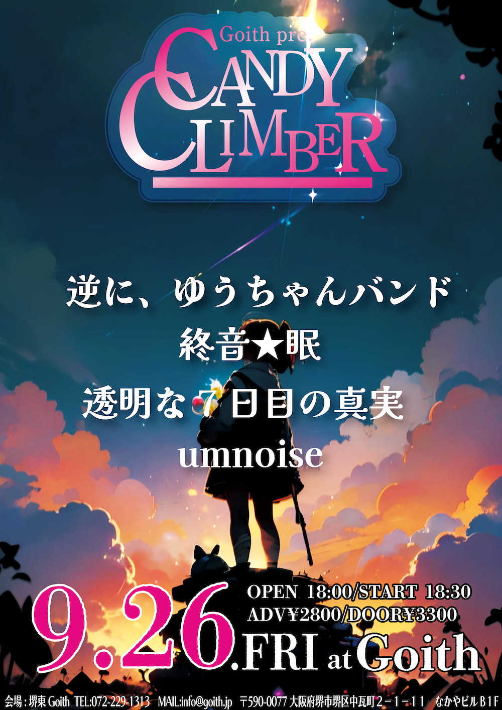 堺東 Goith(ゴイス) スケジュール 2025.9.26(Fri) Goith pre. CANDY CLIMBER [ACT] 逆に、ゆうちゃんバンド / 透明な7日目の真実 / Umnoise / 終音⭐︎眠 [OPEN/START] 18:00/18:30 [料金] ADV/DOOR ¥2800/¥3300 (問)堺東 Goith 072-229-1313 http://goith.jp