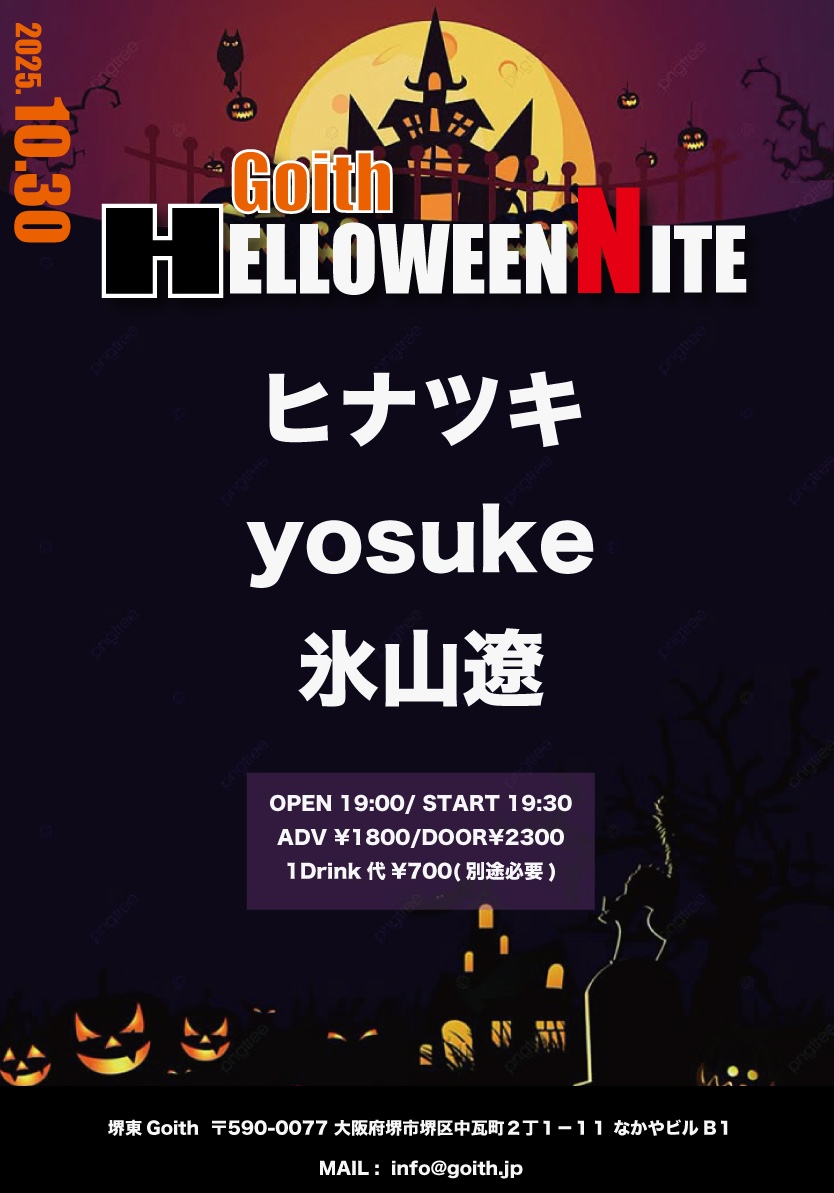 堺東 Goith(ゴイス) スケジュール 2025.10.30(Thu) Goith HELLOWEEN NITE [ACT] ヒナツキ / yosuke / 氷山遼 [OPEN/START] 19:00/19:30 [料金] ADV/DOOR ¥1800/¥2300 ※仮装大歓迎!! 出演者さんもお客様も仮装でご来場いただければGoithからささやかなプレゼントあります♪ (問)堺東 Goith 072-229-1313 http://goith.jp