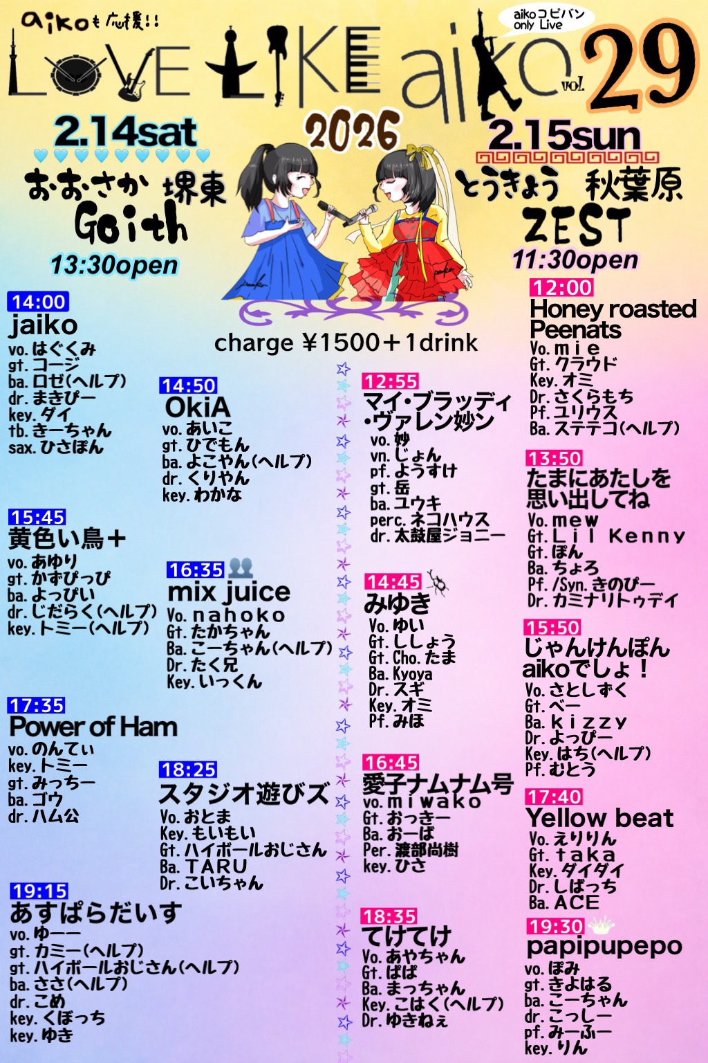堺東 Goith(ゴイス) スケジュール 2026.2.14(Sat) aiko コピバン only Live 【LOVE LIKE aiko vol.29】 [ACT] jaiko / OkiA / 黄色い鳥+ / mix juice / Power of Ham / スタジオ遊びズ / あすぱらだいす [OPEN/START] 13:30/14:00 [料金] ¥1500 ※入場&再入場時1Drink代¥700 別途必要 (問)堺東 Goith 072-229-1313 http://goith.jp