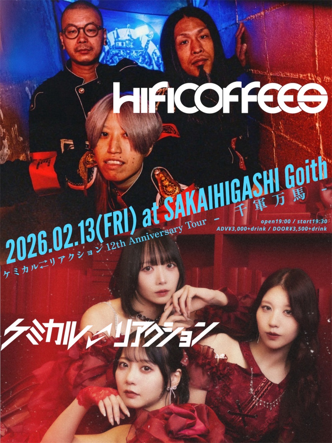 堺東 Goith(ゴイス) スケジュール 2026.2.13(Fri) ケミカル⇄リアクション 12周年〜千軍万馬・堺東編〜 [ACT] ケミカル⇄リアクション / ハイファイコーヒーズ [OPEN/START] 19:00/19:30 [料金] ADV/DOOR ¥3000/¥3500 チケット購入URL https://livepocket.jp/e/7hwbt (問)堺東 Goith 072-229-1313 http://goith.jp