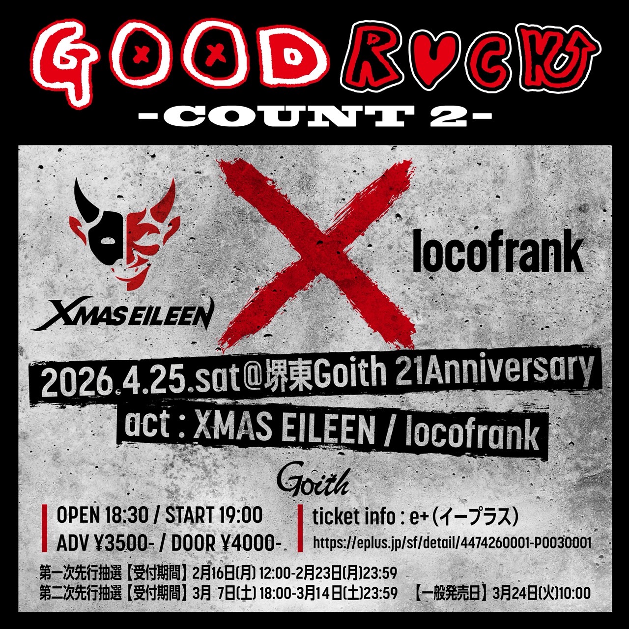堺東 Goith(ゴイス) スケジュール 2026.4.25(Sat) XMAS EILEEN Drum presents 【GOOD ROCK -COUNT 2 - 】 [ACT] XMAS EILEEN / locofrank [OPEN/START] 18:30/19:00 [料金] ADV/DOOR ¥3500/¥4000 (問)堺東 Goith 072-229-1313 http://goith.jp