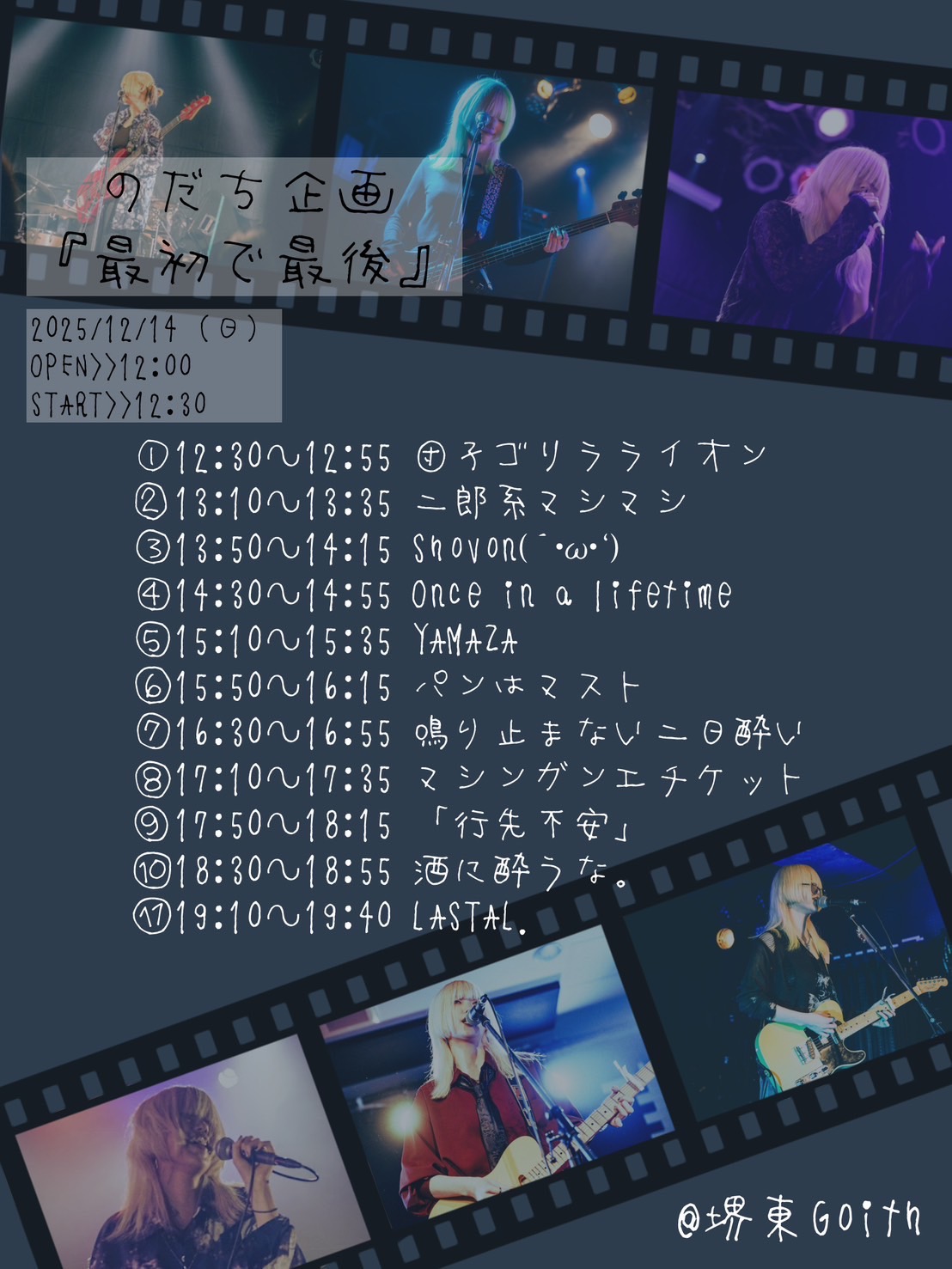 - 団子ゴリラライオン/二郎系マシマシ/Shovon(´•ω•`)/Once in a lifetime/YAMAZA/パンはマスト/鳴り止まない二日酔い/マシンガンエチケット/「行先不安」/酒に酔うな。/LASTAL.