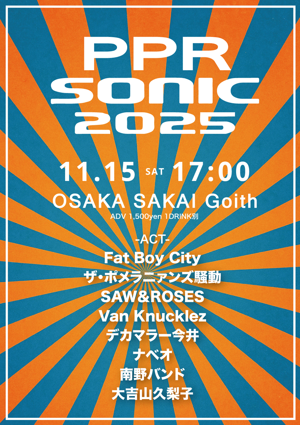堺東 Goith(ゴイス) スケジュール 2025.11.15(Sat) PPR SONIC 2025 [ACT] [LIVE] Fat Boy City / ザ・ポメラニァンズ騒動 / SAW&ROSES / Van Knucklez / デカマラー今井 / ナベオ / 南野バンド / 大吉山久梨子 [OPEN/START] 17:00/17:30 [料金] ADV/DOOR ¥1,500/¥1,500 (問)堺東 Goith 072-229-1313 http://goith.jp