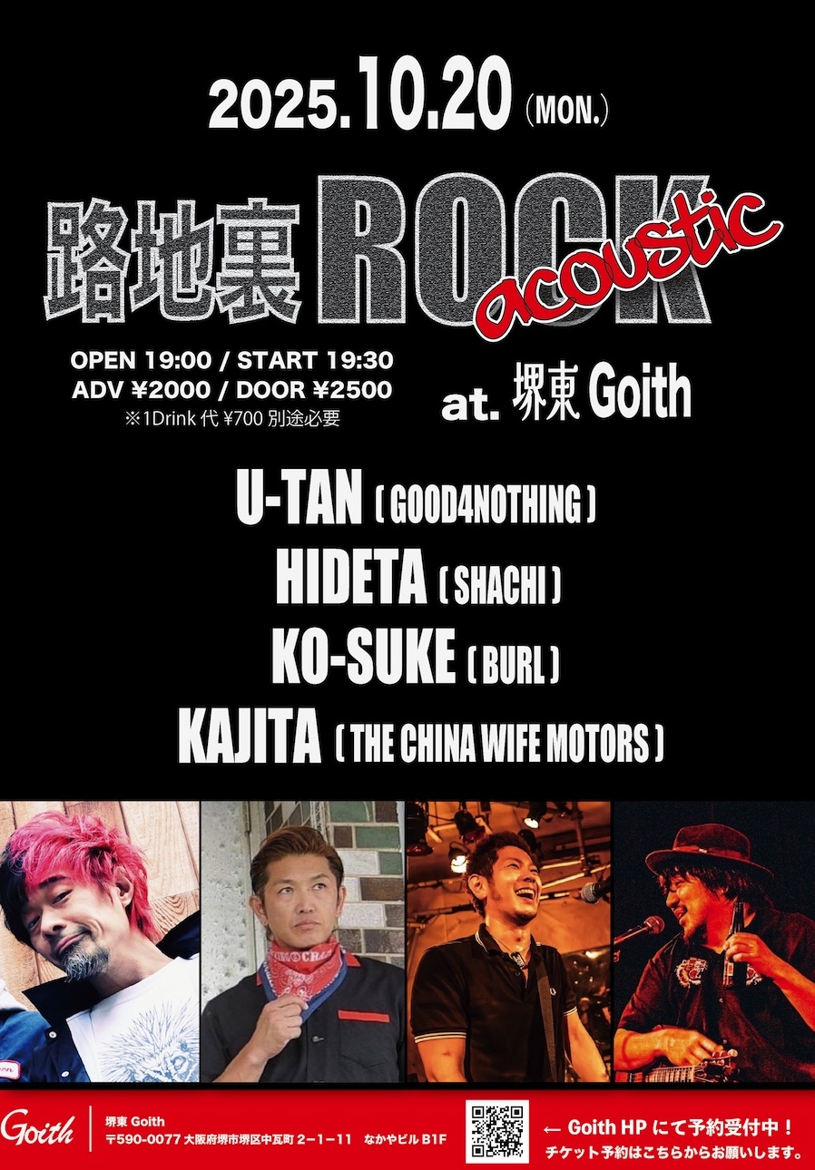 堺東 Goith(ゴイス) スケジュール 2025.10.20(Mon) 路地裏ROCK acoustic [ACT] U-TAN (GOOD4NOTHING) / HIDETA (SHACHI) / KO-SUKE (BURL) / KAJITA (THE CHINA WIFE MOTORS) [OPEN/START] 19:00/19:30 [料金] ADV/DOOR ¥2000/¥2500 (問)堺東 Goith 072-229-1313 http://goith.jp