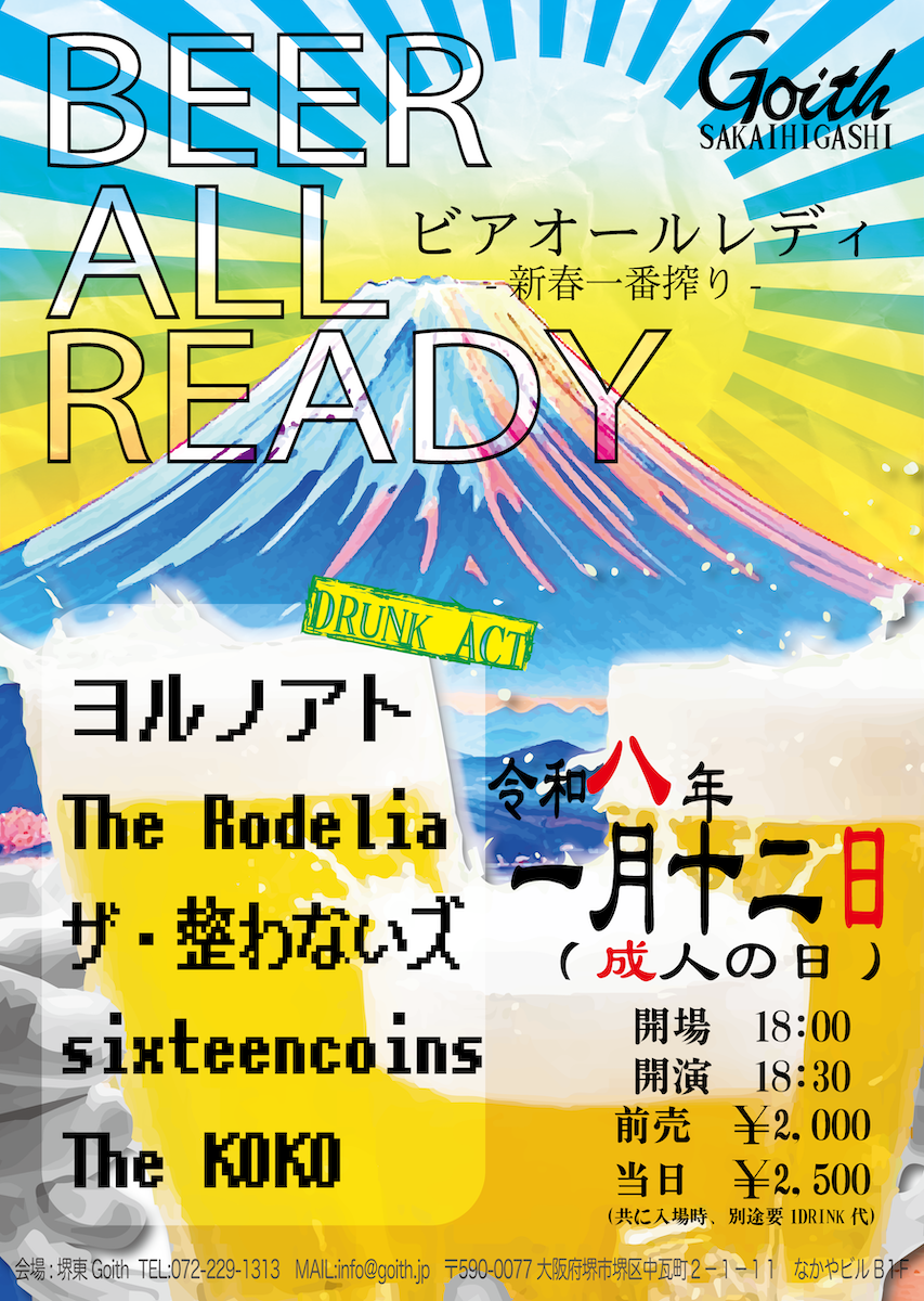 堺東 Goith(ゴイス) スケジュール 2026.1.12(Mon) BEER ALL READY 新春一番搾り [ACT] sixteencoins / The Rodelia / ヨルノアト / ザ・整わないズ / The KOKO [OPEN/START] 18:00/18:30 [料金] ADV/DOOR ¥2000/¥2500 (問)堺東 Goith 072-229-1313 http://goith.jp