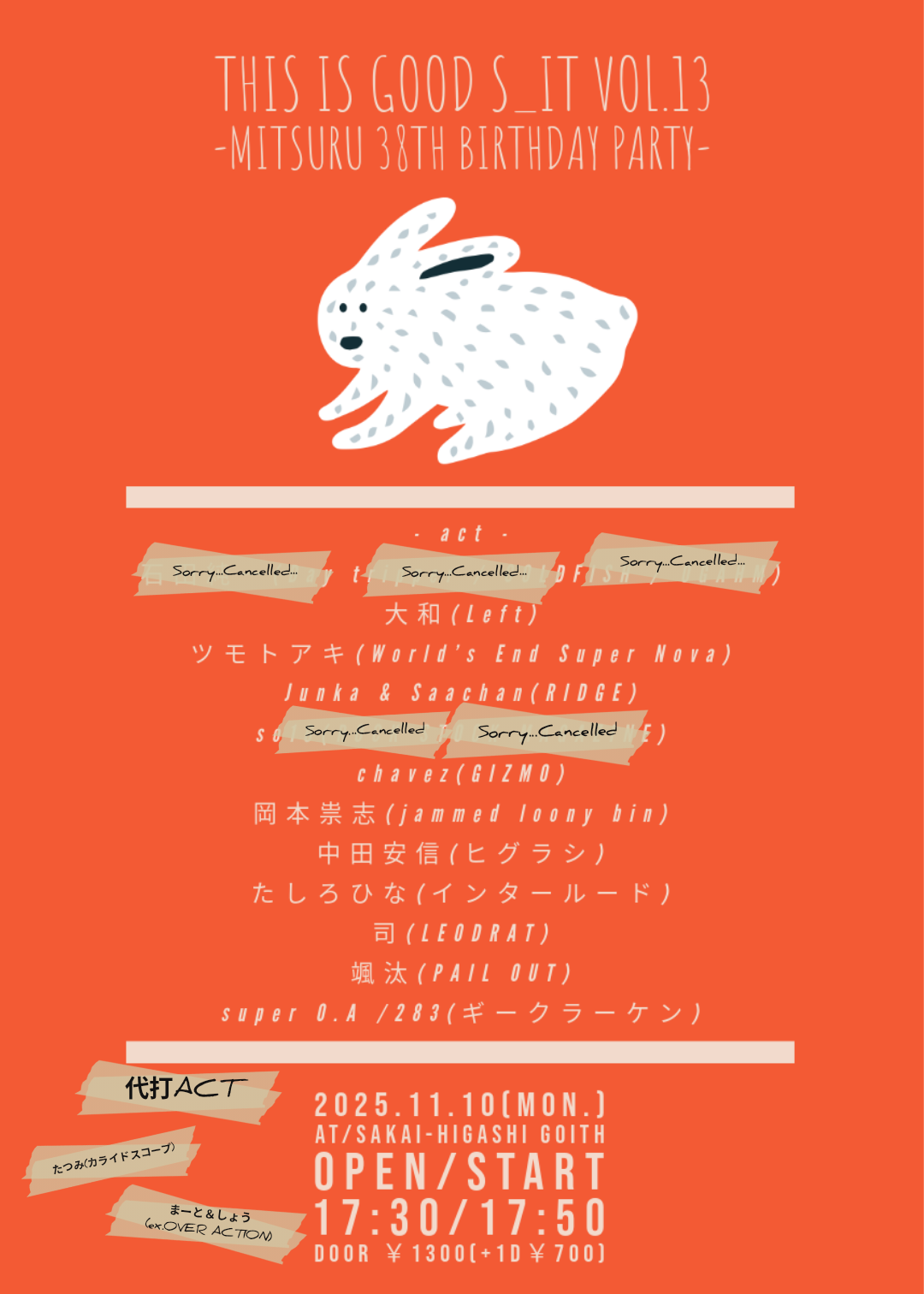 - 大和(Left) / ツモトアキ(World’s End Super Nova) / Junka & Saachan(RIDGE) / chavez(GIZMO) / 岡本祟志(jammed loony bin) / 中田安信(ヒグラシ) / たしろひな(インタールード) / 司(LEODRAT) / 颯汰(PAIL OUT) / -super O.A- 283(ギークラーケン) ※石田純一(Day tripper / COLDFISH / OGAHM)、so16(ROCK STOCK MAGAZINE)は体調不良により出演キャンセルとなりました。 それに伴いたつみ(カライドスコープ)、まーと&しょう(ex.OVER ACTION)が代打出演致します。