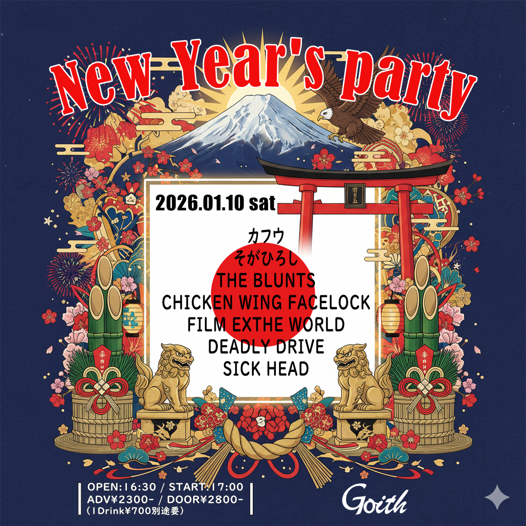 堺東 Goith(ゴイス) スケジュール 2026.1.10(Sat) New Year's party [ACT] そがひろし / THE BLUNTS / カフウ / FILM EXTHE WORLD / SICK HEAD / DEADLY DRIVE / CHICKEN WING FACELOCK [OPEN/START] 16:30/17:00 [料金] ADV/DOOR ¥2300/¥2800 ※1Drink代¥700(別途必要) (問)堺東 Goith 072-229-1313 http://goith.jp