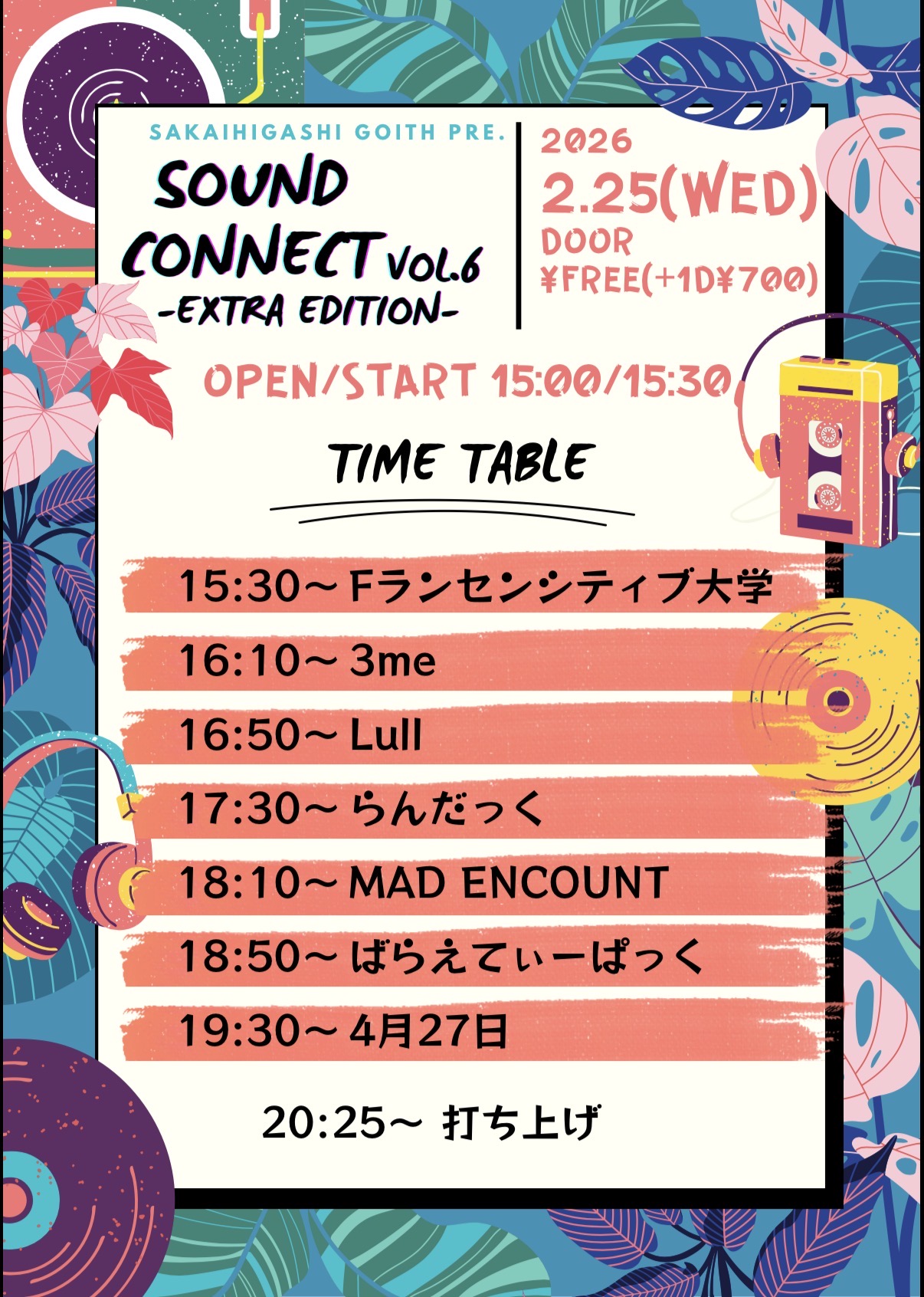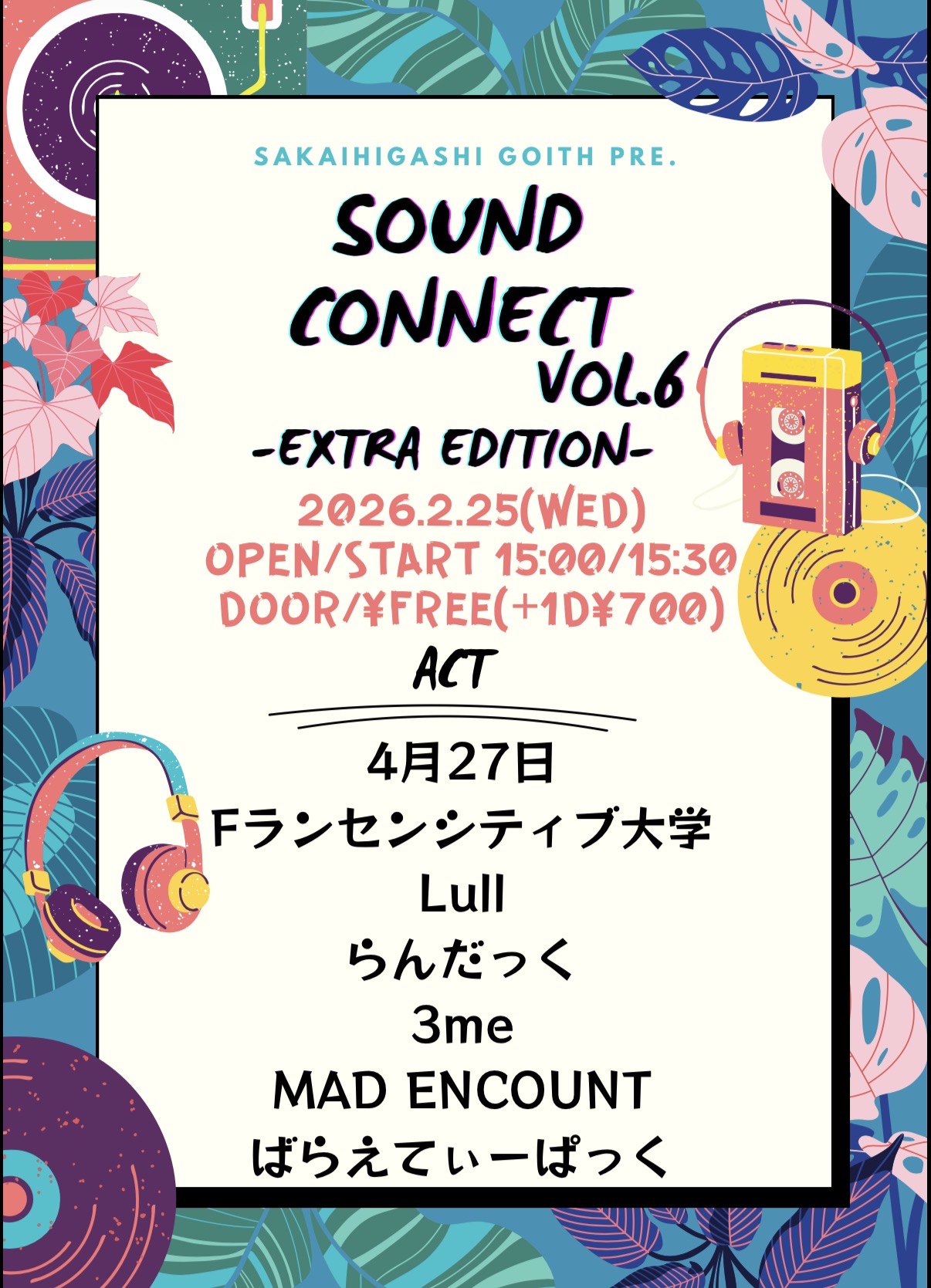 堺東 Goith(ゴイス) スケジュール 2026.2.25(Wed) SOUND CONNECT vol.6 EXTRA EDITION. [ACT] 4月27日/Fランセンシティブ大学/Lull/らんだっく/3me/MAD ENCOUNT/ばらえてぃーぱっく [OPEN/START] 15:00/15:30 [料金] DOOR FREE※入場時&再入場時 1Drink¥700 (問)堺東 Goith 072-229-1313 http://goith.jp
