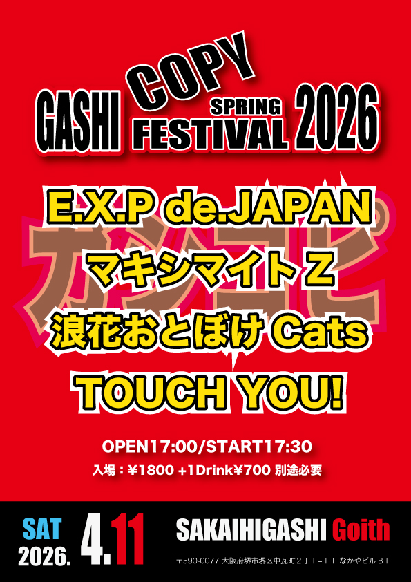 堺東 Goith(ゴイス) スケジュール 2026.4.11(Sat) GASHI COPY FESTIVAL 2026 SPRING [ACT] E.X.P de.JAPAN / マキシマイトZ / 浪花おとぼけCats / TOUCH YOU! [OPEN/START] 17:00/17:30 [料金] 入場¥1800+1Drink代¥700(別途必要) (問)堺東 Goith 072-229-1313 http://goith.jp