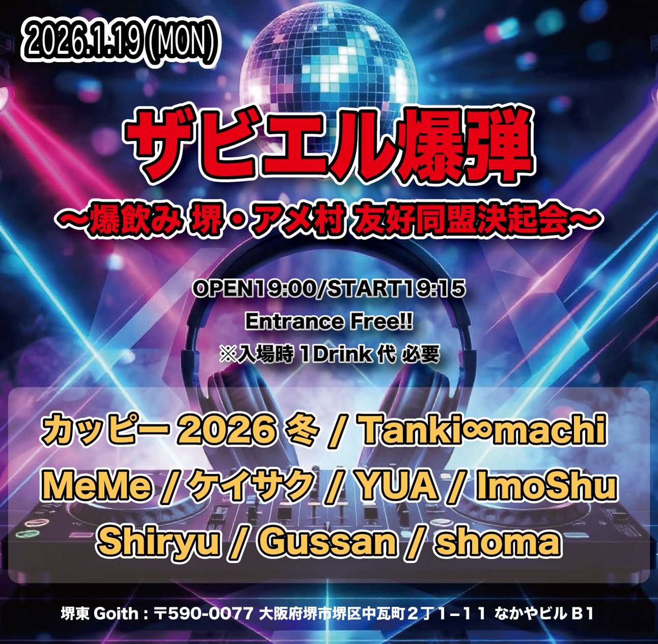 堺東 Goith(ゴイス) スケジュール 2026.1.19(Mon) ザビエル爆弾 ~爆飲み 堺・アメ村友好同盟決起会~ [ACT] DJ : カッピー2026 冬 / Tanki∞machi MeMe /ケイサク / YUA / ImoShu Shiryu / Gussan / shoma [OPEN/START] 19:00/19:15 [料金] 入場FREE + 1Drink代 ¥700 別途必要 (問)堺東 Goith 072-229-1313 http://goith.jp
