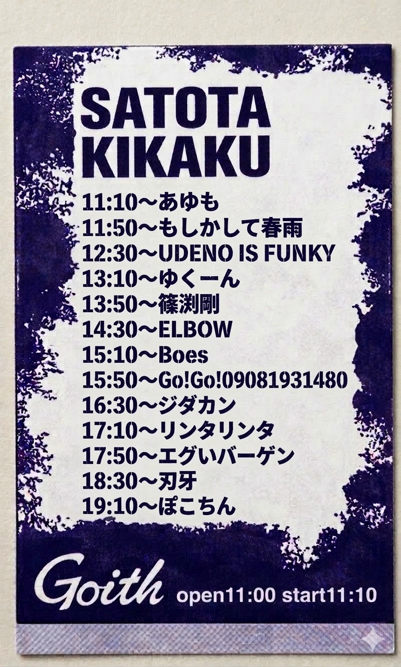 堺東 Goith(ゴイス) スケジュール 2026.3.19(Thu) さとた企画 [ACT] あゆも / もしかして春雨 / UDENO IS FUNKY / ゆくーん / 篠渕剛 / ELBOW / Boes / Go!Go!09081931480 / ジダカン / リンタリンタ / エグいバーゲン / 刃牙 / ぽこちん [OPEN/START] 11:00/11:10 [料金] FREE(+1D¥700) (問)堺東 Goith 072-229-1313 http://goith.jp